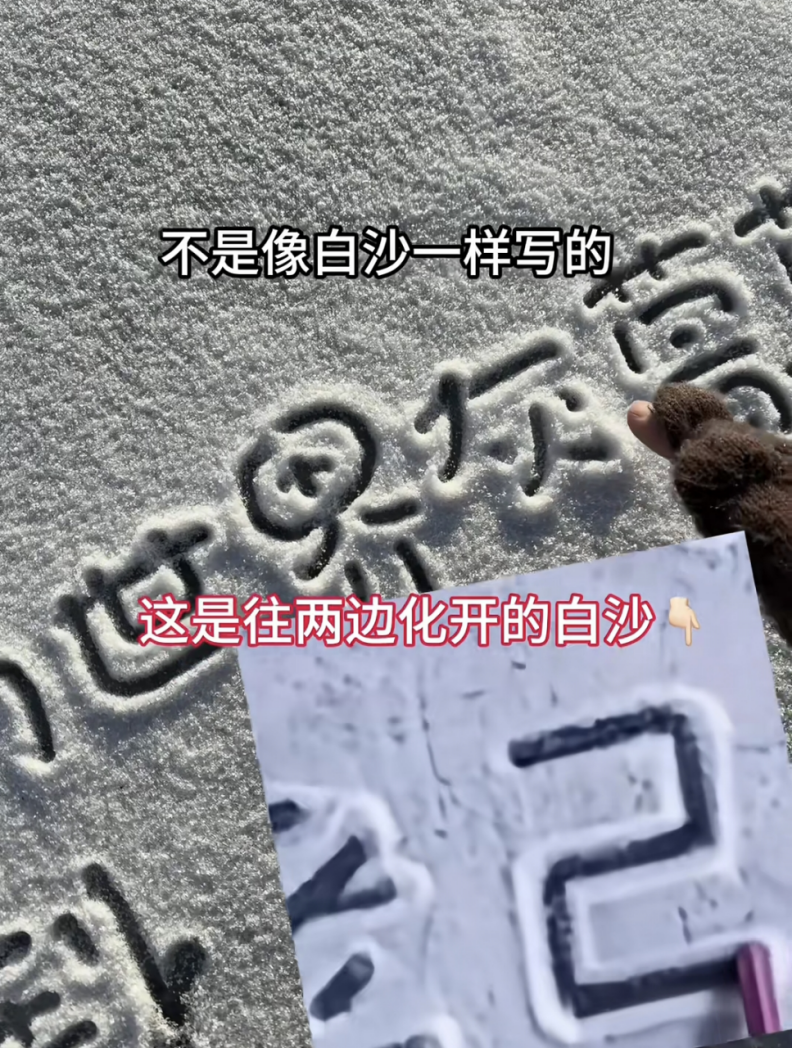 有提供雪地代写服务的博主发布视频,科普用真雪和白沙写字的区别。(图/社交媒体截图)